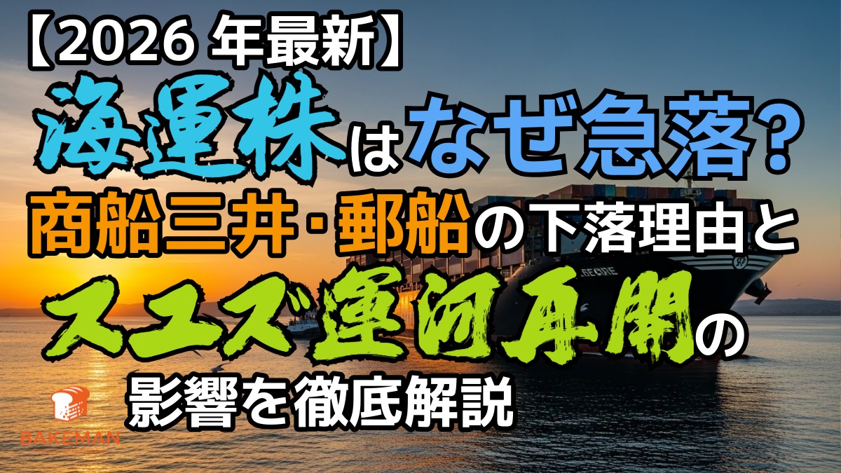 はじめに:海運セクターに走る衝撃 2026年1月、これまで高配当株として人気を集めてきた海運株(日本郵船、商船三井、川崎汽船)が大きな調整局面を迎えています。 「なぜ急に株価が下がったのか?」 「スエズ運河の再開は良いニュースではないのか?」 多くの投資家が抱くこの疑問に対し、結論から言えば、現在の市場は「供給の津波(Supply Tsunami)」を警戒しています。紅海危機の沈静化とスエズ運河の再開は、物流にとって朗報である一方、海運市況にとっては「運賃暴落のトリガー」となり得るのです。 本記事では、最 ...