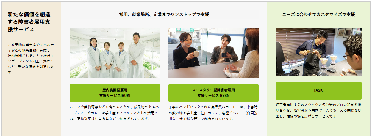 - サテライトオフィス「INCLU(インクル)」: 企業に障害者雇用のためのオフィスと支援スタッフを提供。
