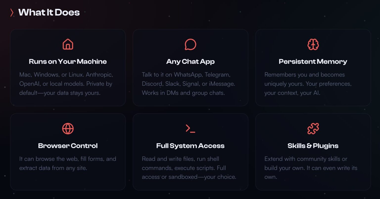 最大の魅力は「実際に動くAI(AI that actually does things)」という哲学です。質問に答えるだけでなく、メール送信、カレンダー管理、さらにはブラウザを操作して航空便のチェックインを行うといった実務を、ユーザーが普段使っているメッセージングアプリ経由で遂行します。